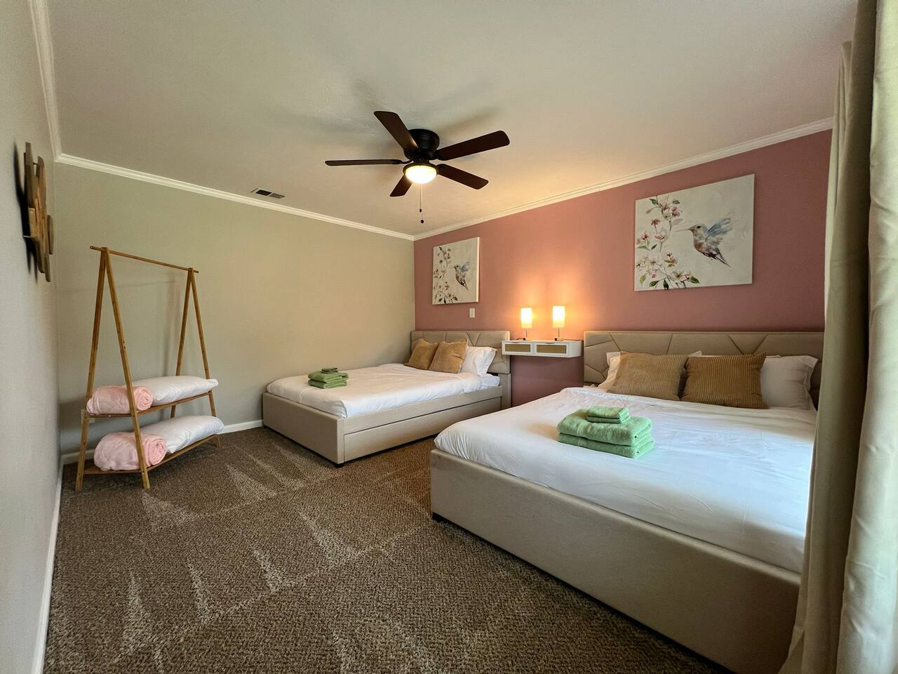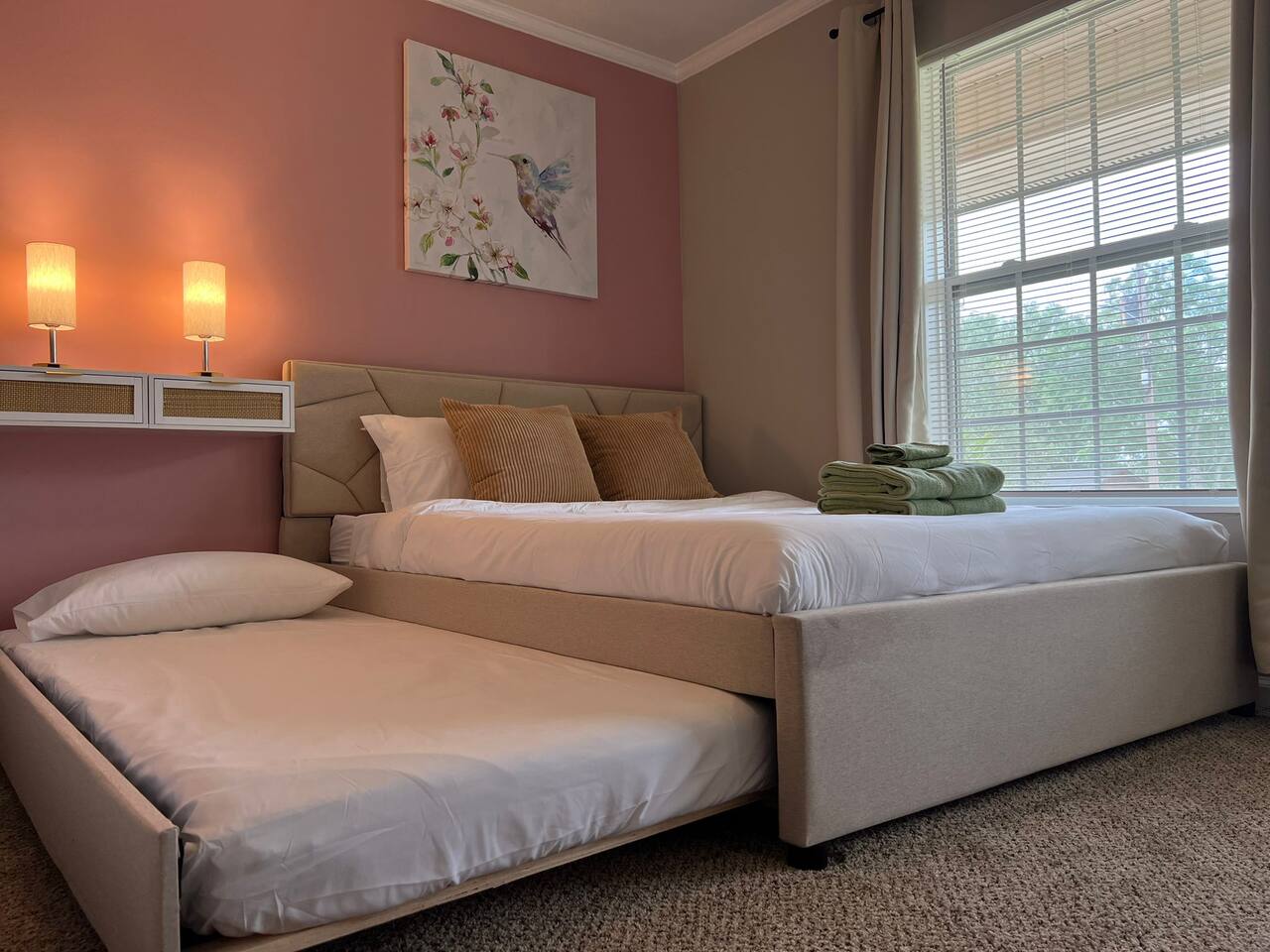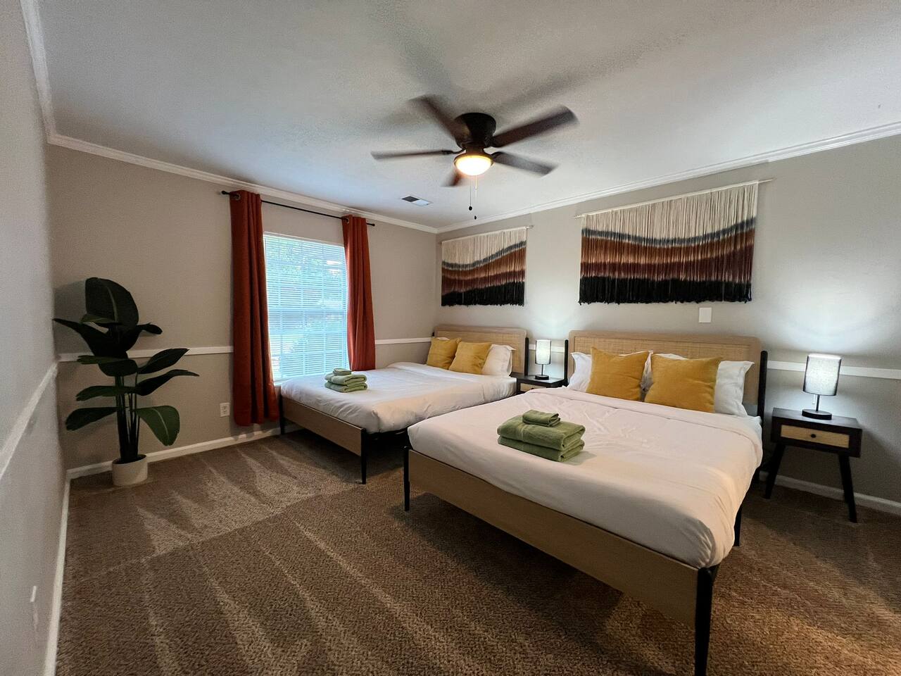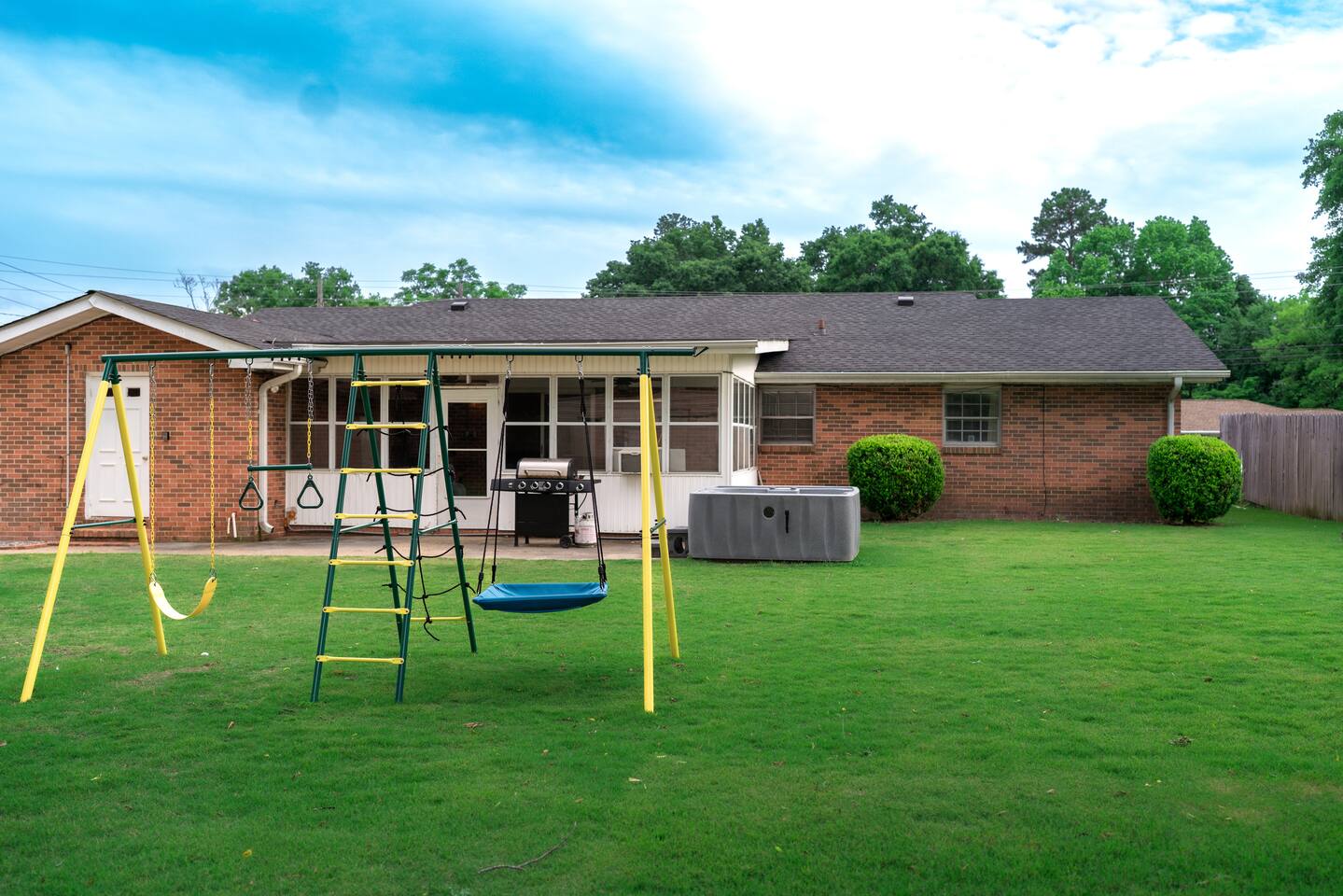 <b>Welcome to the Green Hummingbird</b> - your spacious, single-story Columbus oasis thoughtfully designed for relaxation, fun, and convenience! With just 1-2 steps to enter, accessibility and comfort come together seamlessly. 🌟 <b>Highlights of Your Stay:</b> 📍 <b>Prime Location:</b> Ideally situated minutes from Fort Benning, restaurants, shopping, and local attractions like the Chattahoochee River Rafting, the Green Hummingbird blends tranquility with unbeatable convenience, making it the ideal base for military graduations, family reunions, and exploring Columbus. 🌿 <b>Backyard Bliss:</b> Enjoy our fully fenced backyard featuring a vibrant children's playset, perfect for endless adventures. Grill up delicious meals in the BBQ area or relax and unwind in the bubbling hot tub under the stars. 🎱 <b>Sunroom Fun Zone:</b> Step into our sun-drenched game room boasting panoramic views of the lush backyard. Here, laughter fills the air with lively pool table matches and exciting arcade competitions and a variety of board games - ideal for guests of all ages. 🏡 <b>Open-Concept Living:</b> Step inside to a beautifully designed open space connecting the kitchen, dining room, and living area—perfect for socializing, family gatherings, and creating lasting memories together. 🍳 <b>Gourmet Kitchen Comfort:</b> Our fully equipped kitchen is your culinary playground, featuring modern appliances including a stove, oven, refrigerator, microwave, and dishwasher. Delight in complimentary coffee and tea or whip up smoothies with the provided blender. Everything you need - from cookware to pantry basics- is thoughtfully provided for memorable meals. 🍽️ <b>Dining Delight:</b> Gather around the spacious dining table comfortably seating up to 8 guests- perfect for sharing delicious meals, playing board games, or planning adventures together. 🛏️ <b>Restful Retreats:</b> Our home comfortably sleeps up to 16 guests across five inviting bedrooms: <b>Bedroom 1</b>: King master suite with private en-suite bathroom and own TV <b>Bedroom 2</b>: Cozy queen bed for restful sleep <b>Bedroom 3</b>: Quiet queen bedroom, perfect for relaxation <b>Bedroom 4</b>: Versatile Double Queen Trundle room accommodating up to 6. <b>Bedroom 5:</b> Spacious Double Queen room adjacent to the kitchen 🛁 <b>Refreshing Bathrooms:</b> Two conveniently located bathrooms—including a serene, spa-inspired master bath—ensure a refreshing and stress-free experience. 📺 <b>Comfortable Living Area:</b> Gather in our stylish yet cozy living room featuring plush seating, warm decor, abundant natural light, and a 65" Smart HDTV—perfect for movie nights and downtime with family and friends. ✨ We're committed to ensuring your stay is comfortable, enjoyable, and truly memorable. We can't wait to welcome you to Green Hummingbird!