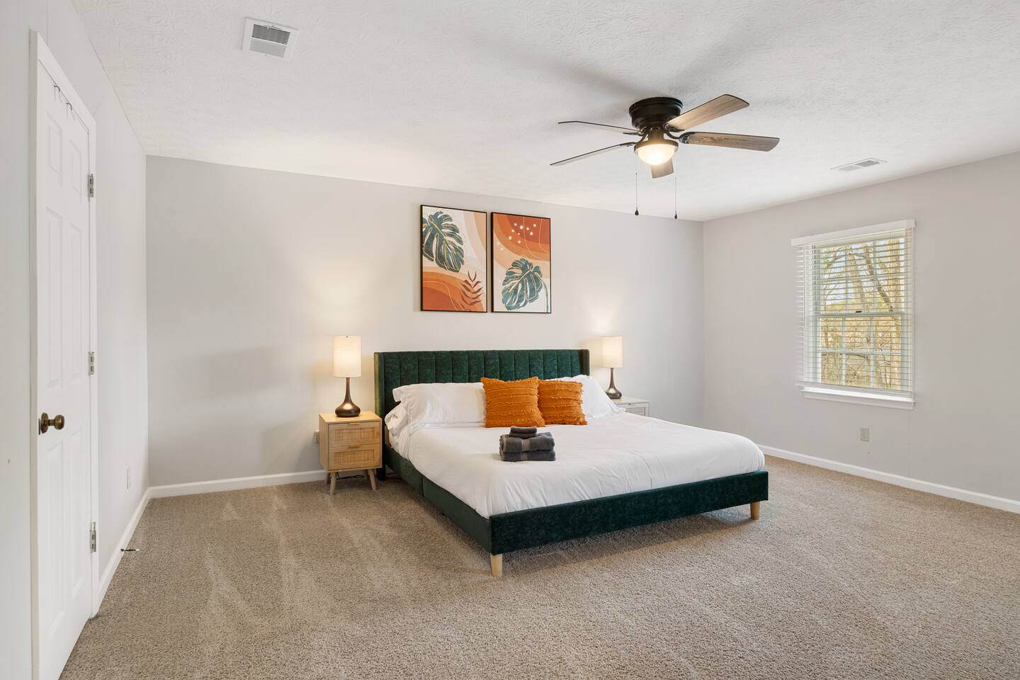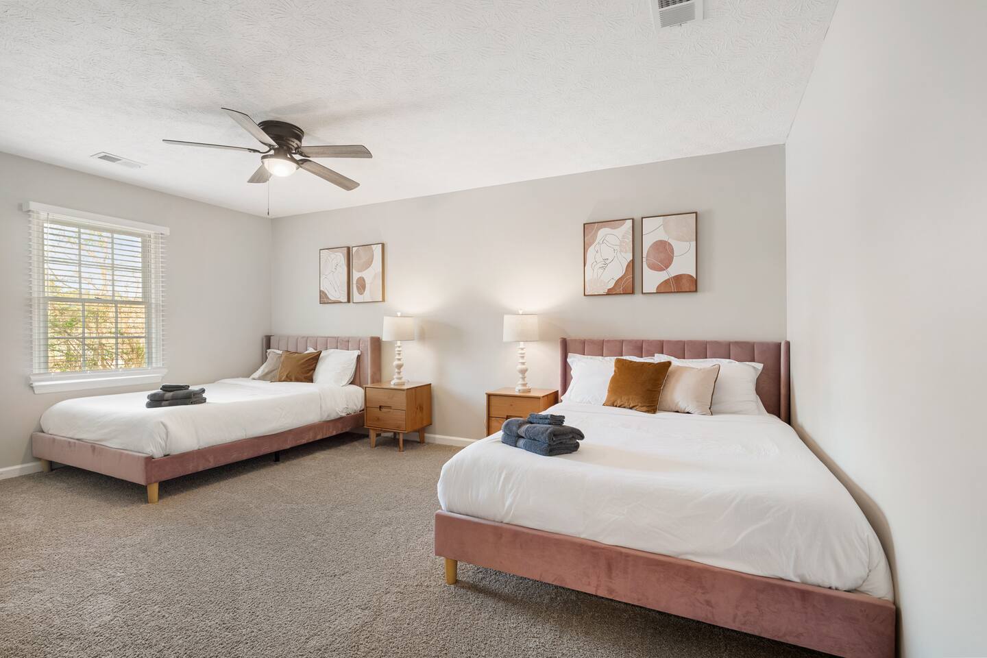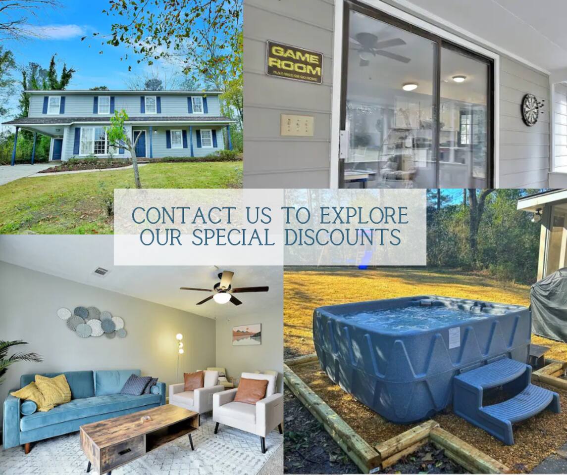 Embrace the comfort and adventure at Blue Humming Bird in North Columbus, a prime location for military families attending <b>Fort Benning graduations</b>, and thrill-seekers drawn to the Chattahoochee River's white water rafting. <b>Highlighted features of Blue Humming Bird:</b> → <b>Central Location</b>: Mins from shop and dine, the army base, the convention center and Flat Rock Park. → Peaceful setting <b>near the U.S. Army's prominent Fort Benning base</b> → <b>Military discount available</b> to honor our service members → Wi-Fi, washer & dryer, and a 65” SmartTV with Roku for all your needs <b>The kitchen is a chef's dream, equipped with:</b> → Stainless steel appliances, granite counters, and every cooking essential → Blender for smoothies or mixed drinks → An array of glassware, wine glasses, and opener for evening celebrations → Krups coffee maker <b>Entertainment and leisure at its best:</b> → Engaging game room with air hockey and arcade game → Wide backyard with playground—perfect for family fun → Private outdoor hot tub for peaceful soaks. → Outdoor BBQ. <b>Sleeping arrangements are tailored for comfort and convenience:</b> → Bedroom #1 : Upstairs A king bed in the master suite with an en-suite bathroom for privacy → Bedroom #2: Upstairs Two queen beds and a bunk bed, ideal for groups or families. Available for groups of 10 or more. → Bedroom #3: Upstairs a single queen bed for a restful night's sleep. → Bedroom #4: Downstairs Queen bed with a bunk bed for friends or children. → Bedroom #5: Downstairs offering another cozy queen bed. The Blue Humming Bird is one of the few large homes in Columbus, offering ample space, a host of amenities, and a perfect blend of tranquility and local attractions for a memorable stay. <b>Living Area</b>: Serene Retreat with Modern Comforts Step into a living space where contemporary design meets comfort. A calming color palette with earth tones and a sky blue pop sets the stage for relaxation, complemented by plush seating and a 65" HDTV with Roku for your entertainment. Rustic-chic décor and natural light enhance the ambiance, creating a perfect setting for family memories or serene moments alone. <b>Sleek Gourmet Kitchen</b>: Meets Family-Friendly Dining. Embrace the heart of the home in our fully-equipped kitchen, a blend of functionality and sleek design. Granite countertops and stainless steel appliances inspire culinary adventures, while the open layout encourages social cooking and easy conversation. The open-concept dining area, where the stylish, modern table awaits family feasts, casual brunches, or an evening of board games. The dining area, brightened by natural light from the sliding doors, offers a view of the game area and backyard. <b>Game Area</b>: Endless Fun and Relaxation Haven Discover the ultimate leisure space in our sunlit game room, designed for endless entertainment and relaxation. Whether you're in the mood for competitive ping pong or arcade matches or a tranquil moment swinging in the hanging chair, this room provides a versatile setting for guests of all ages. Surrounded by panoramic windows that offer serene views of the outdoors, the game room serves as a bright and airy escape. <b>Backyard & BBQ:</b> Nature's Playground and Grilling Paradise Escape to the expansive backyard where laughter and joy resonate through the air. Here, a vibrant playset awaits the energetic spirits of children, offering hours of amusement amidst the gentle whispers of nature. This private outdoor haven, bordered by a lush tree line, is an idyllic spot for guests to enjoy the simpler pleasures—whether it's a round of tag on the grass or a serene afternoon on the swings. As the sun sets, gather around the BBQ grill for an evening of grilling, where every meal is infused with the essence of the outdoors. <b>Outdoor Hot Tub</b>: Soothe and Soak in Blissful Warmth Imagine a secluded spot in the backyard dedicated to your relaxation and well-being, featuring a spacious hot tub ready to melt away the day's stress. This outdoor hot tub is nestled in a quiet corner of the garden, offering a peaceful retreat surrounded by nature. It's the perfect complement to a day of play or exploration, providing therapeutic warmth and serenity under the open sky. As dusk falls, the bubbling waters beckon for starlit soaks and quiet conversations. Certainly! Here are the bedroom descriptions tailored to highlight each room's unique features and comfort, providing guests with a clear picture of the inviting spaces awaiting them at the Blue Humming Bird. <b>Sleeping Arrangements</b> <b>Master Bedroom (Bedroom #1):</b> Escape to the master suite, where luxury meets tranquility. A plush king bed promises restful nights, complemented by an en-suite bathroom offering privacy and convenience. Modern décor and a dedicated workspace ensure a blend of relaxation and productivity, making it a perfect retreat for every guest. <b>Bedroom #2:</b> Spacious and versatile, this room houses two queen beds and an additional bunk bed, accommodating various group dynamics. It's a haven of comfort and relaxation, where soft linens and gentle hues invite you to a restful sleep. Available for larger groups, this bedroom unlocks with bookings of 10 or more <b>Bedroom #3:</b> Simplicity and elegance define this room, offering a queen bed set against a backdrop of minimalist design. Ideal for guests seeking a peaceful retreat, its soothing palette and thoughtful touches ensure a rejuvenating stay. <b>Bedroom #4:</b> Designed with families and friends in mind, this room features a comfortable queen bed and a playful bunk bed, ideal for children or additional guests. Natural light and serene décor create a calming ambiance, perfect for unwinding after a day of adventure. <b>Bedroom #5:</b> A cozy queen bed awaits, offering the same level of comfort and style as the rest of the home. <b>Bathrooms</b> The house boasts three convenient bathrooms: <
