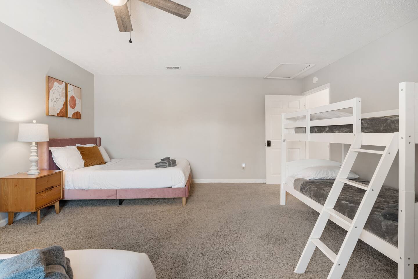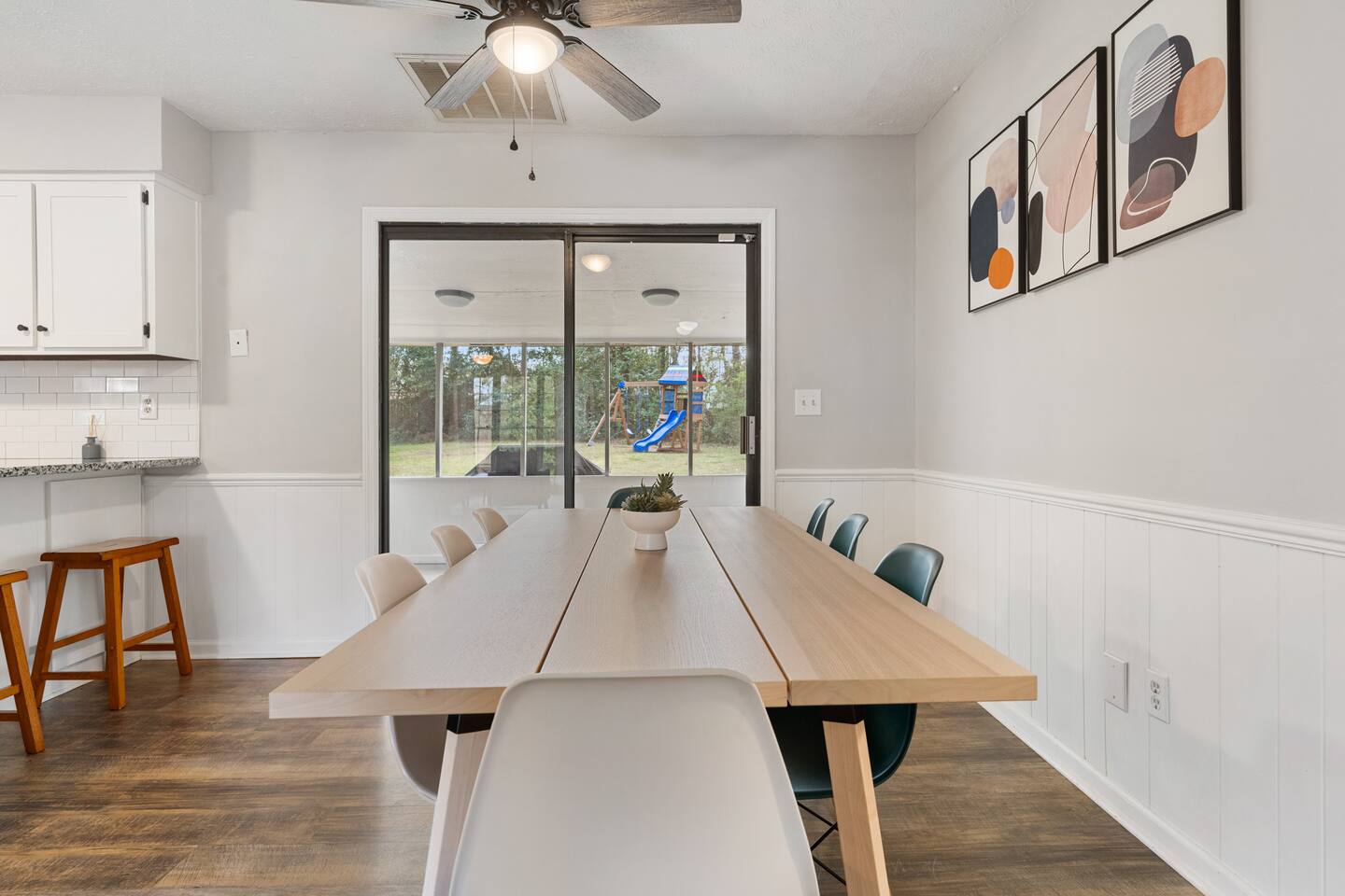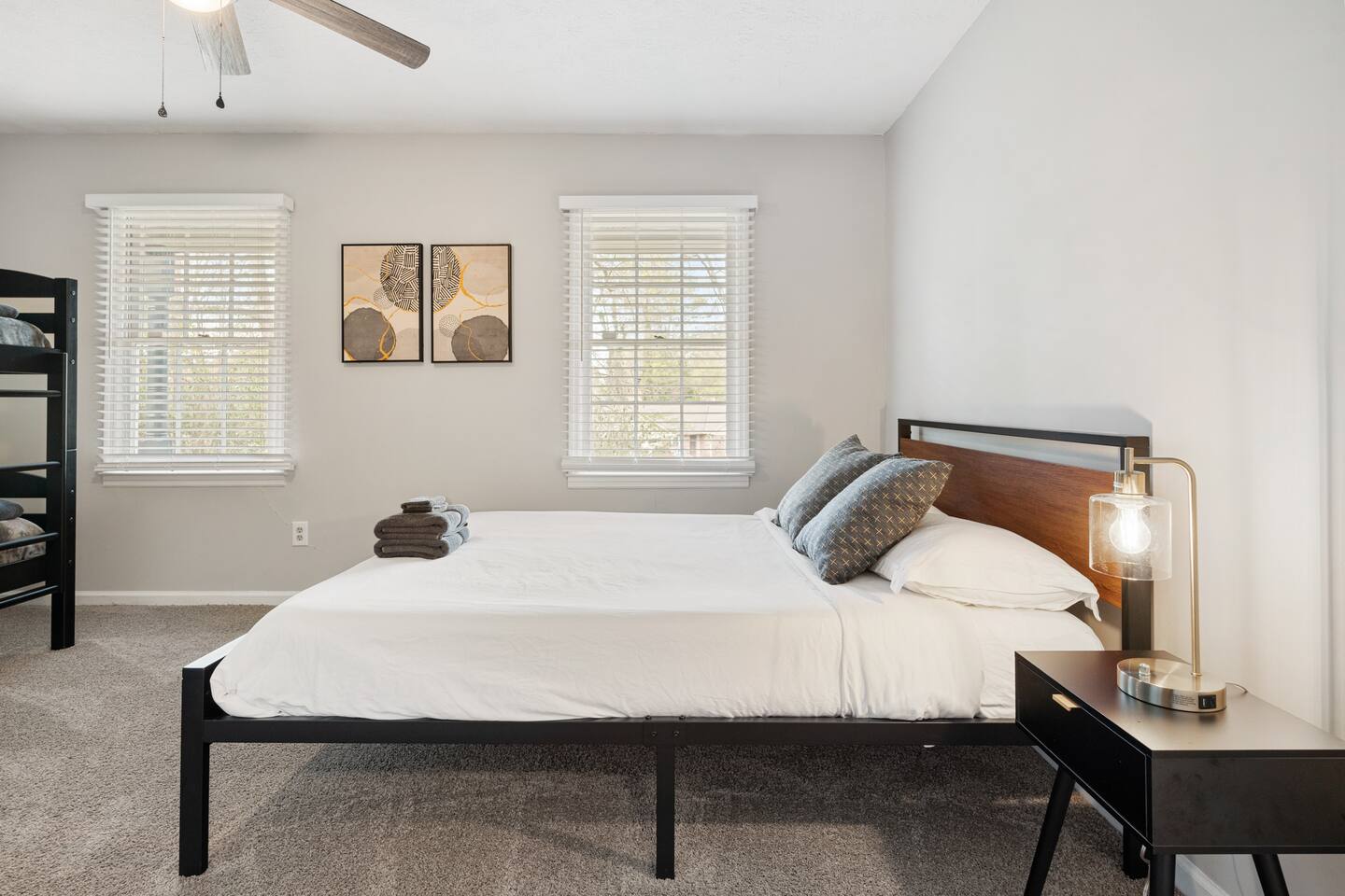 Embrace the comfort and adventure at Blue Humming Bird in North Columbus, a prime location for military families attending <b>Fort Benning graduations</b>, and thrill-seekers drawn to the Chattahoochee River's white water rafting. <b>Highlighted features of Blue Humming Bird:</b> → <b>Central Location</b>: Mins from shop and dine, the army base, the convention center and Flat Rock Park. → Peaceful setting <b>near the U.S. Army's prominent Fort Benning base</b> → <b>Military discount available</b> to honor our service members → Wi-Fi, washer & dryer, and a 65” SmartTV with Roku for all your needs <b>The kitchen is a chef's dream, equipped with:</b> → Stainless steel appliances, granite counters, and every cooking essential → Blender for smoothies or mixed drinks → An array of glassware, wine glasses, and opener for evening celebrations → Krups coffee maker <b>Entertainment and leisure at its best:</b> → Engaging game room with air hockey and arcade game → Wide backyard with playground—perfect for family fun → Private outdoor hot tub for peaceful soaks. → Outdoor BBQ. <b>Sleeping arrangements are tailored for comfort and convenience:</b> → Bedroom #1 : Upstairs A king bed in the master suite with an en-suite bathroom for privacy → Bedroom #2: Upstairs Two queen beds and a bunk bed, ideal for groups or families. Available for groups of 10 or more. → Bedroom #3: Upstairs a single queen bed for a restful night's sleep. → Bedroom #4: Downstairs Queen bed with a bunk bed for friends or children. → Bedroom #5: Downstairs offering another cozy queen bed. The Blue Humming Bird is one of the few large homes in Columbus, offering ample space, a host of amenities, and a perfect blend of tranquility and local attractions for a memorable stay. <b>Living Area</b>: Serene Retreat with Modern Comforts Step into a living space where contemporary design meets comfort. A calming color palette with earth tones and a sky blue pop sets the stage for relaxation, complemented by plush seating and a 65" HDTV with Roku for your entertainment. Rustic-chic décor and natural light enhance the ambiance, creating a perfect setting for family memories or serene moments alone. <b>Sleek Gourmet Kitchen</b>: Meets Family-Friendly Dining. Embrace the heart of the home in our fully-equipped kitchen, a blend of functionality and sleek design. Granite countertops and stainless steel appliances inspire culinary adventures, while the open layout encourages social cooking and easy conversation. The open-concept dining area, where the stylish, modern table awaits family feasts, casual brunches, or an evening of board games. The dining area, brightened by natural light from the sliding doors, offers a view of the game area and backyard. <b>Game Area</b>: Endless Fun and Relaxation Haven Discover the ultimate leisure space in our sunlit game room, designed for endless entertainment and relaxation. Whether you're in the mood for competitive ping pong or arcade matches or a tranquil moment swinging in the hanging chair, this room provides a versatile setting for guests of all ages. Surrounded by panoramic windows that offer serene views of the outdoors, the game room serves as a bright and airy escape. <b>Backyard & BBQ:</b> Nature's Playground and Grilling Paradise Escape to the expansive backyard where laughter and joy resonate through the air. Here, a vibrant playset awaits the energetic spirits of children, offering hours of amusement amidst the gentle whispers of nature. This private outdoor haven, bordered by a lush tree line, is an idyllic spot for guests to enjoy the simpler pleasures—whether it's a round of tag on the grass or a serene afternoon on the swings. As the sun sets, gather around the BBQ grill for an evening of grilling, where every meal is infused with the essence of the outdoors. <b>Outdoor Hot Tub</b>: Soothe and Soak in Blissful Warmth Imagine a secluded spot in the backyard dedicated to your relaxation and well-being, featuring a spacious hot tub ready to melt away the day's stress. This outdoor hot tub is nestled in a quiet corner of the garden, offering a peaceful retreat surrounded by nature. It's the perfect complement to a day of play or exploration, providing therapeutic warmth and serenity under the open sky. As dusk falls, the bubbling waters beckon for starlit soaks and quiet conversations. Certainly! Here are the bedroom descriptions tailored to highlight each room's unique features and comfort, providing guests with a clear picture of the inviting spaces awaiting them at the Blue Humming Bird. <b>Sleeping Arrangements</b> <b>Master Bedroom (Bedroom #1):</b> Escape to the master suite, where luxury meets tranquility. A plush king bed promises restful nights, complemented by an en-suite bathroom offering privacy and convenience. Modern décor and a dedicated workspace ensure a blend of relaxation and productivity, making it a perfect retreat for every guest. <b>Bedroom #2:</b> Spacious and versatile, this room houses two queen beds and an additional bunk bed, accommodating various group dynamics. It's a haven of comfort and relaxation, where soft linens and gentle hues invite you to a restful sleep. Available for larger groups, this bedroom unlocks with bookings of 10 or more <b>Bedroom #3:</b> Simplicity and elegance define this room, offering a queen bed set against a backdrop of minimalist design. Ideal for guests seeking a peaceful retreat, its soothing palette and thoughtful touches ensure a rejuvenating stay. <b>Bedroom #4:</b> Designed with families and friends in mind, this room features a comfortable queen bed and a playful bunk bed, ideal for children or additional guests. Natural light and serene décor create a calming ambiance, perfect for unwinding after a day of adventure. <b>Bedroom #5:</b> A cozy queen bed awaits, offering the same level of comfort and style as the rest of the home. <b>Bathrooms</b> The house boasts three convenient bathrooms: <