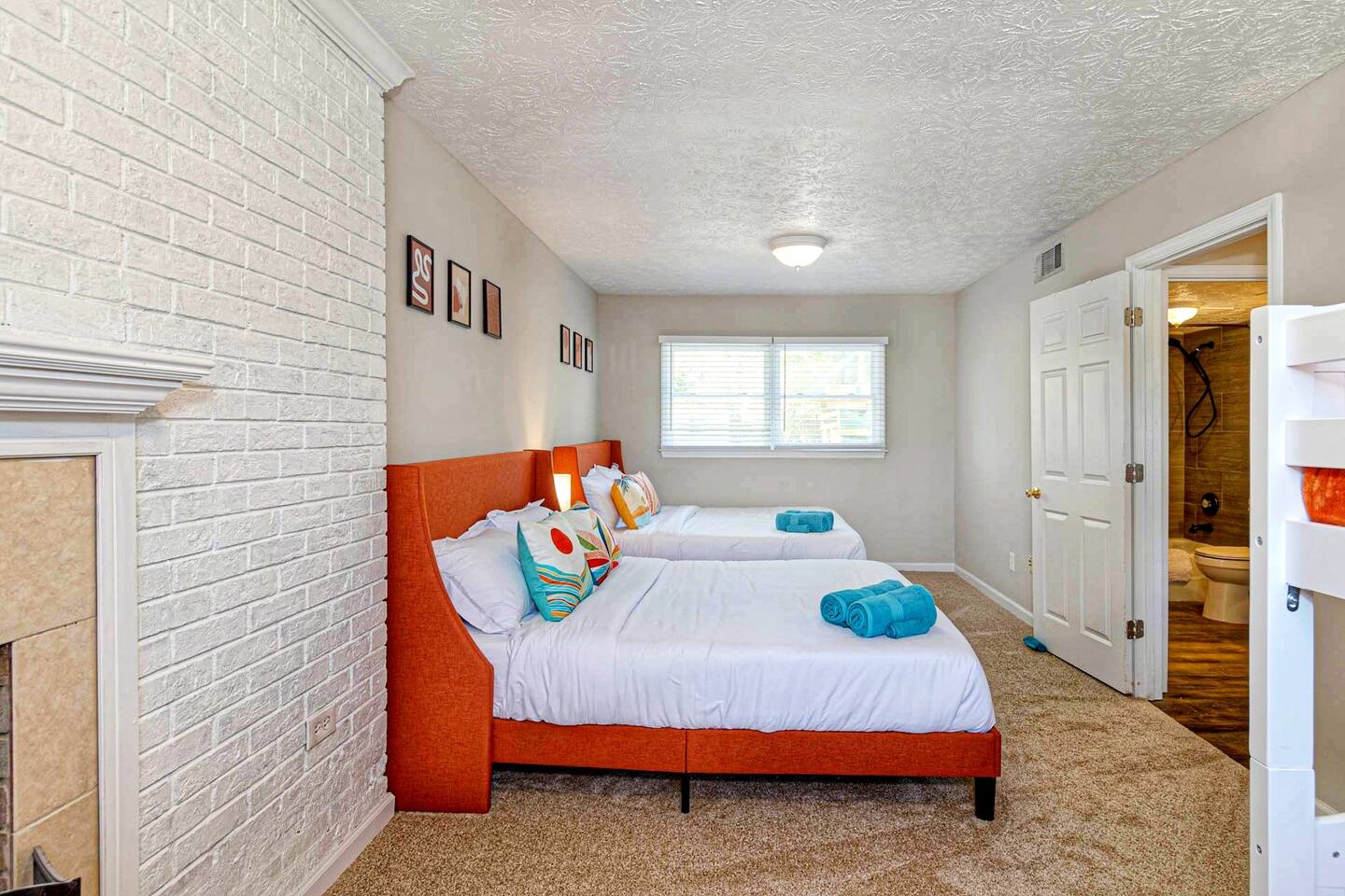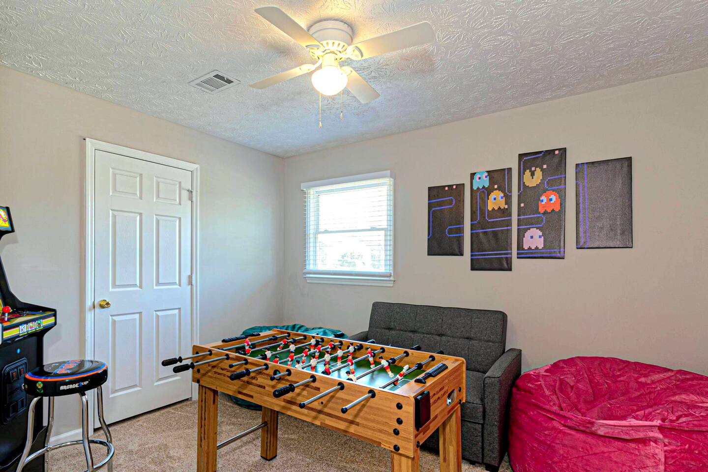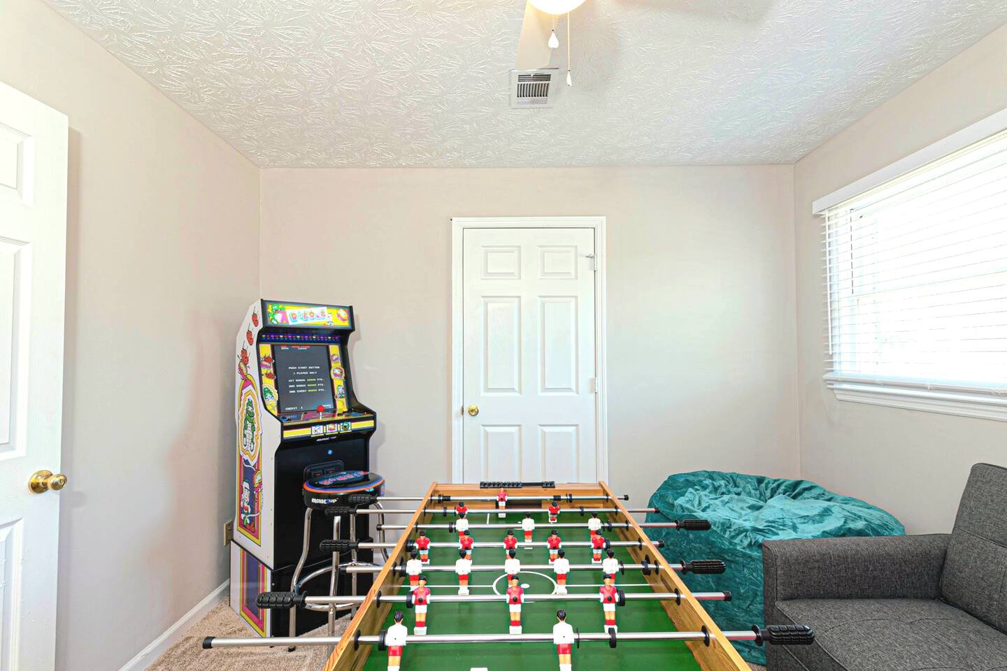 <b>Coming forTurning Blue, Green, Airborne,or OSUT?</b> Step inside he Gold Hummingbird to discover a bright, open layout with multiple living areas, making it easy for everyone to spread out or come together. The fully equipped kitchen has everything you need to cook hearty meals, and the spacious dining area is perfect for gathering around after a day of exploring or celebrating. Upstairs you'll find cozy bedrooms and a peaceful vibe, while downstairs brings the energy — featuring a game room with activities for all ages and easy access to the backyard. And of course… the pool! Step outside and you’re greeted with your very own guitar-shaped private pool — a fun and unforgettable centerpiece your group will love. Whether you're soaking up the sun, firing up the grill, or enjoying a late-night swim under the stars, this backyard delivers both relaxation and good times. The perfect spot for military families attending <b>Fort Benning graduations</b>, thrill-seekers eager for Chattahoochee River white water rafting, and sports fans catching exciting minor league games. <b>Highlighted features of Gold Humming Bird:</b> → <b>Prime Location</b>: Just minutes from shopping, dining, the army base, the convention center, and the new Minor League Stadium. → Tranquil setting <b>Conveniently located near the U.S. Army's prominent Fort Benning base. </b> → <b>Military discount available</b> Honoring service members with special rates. → Enjoy modern conveniences like high-speed Wi-Fi, a washer & dryer, and a 65” SmartTV with Roku. <b>The kitchen is a chef's dream features:</b> → Stainless steel appliances, granite countertops, and all the essentials for cooking. → Blender for smoothies or cocktails → A variety of glassware, including wine glasses and an opener for evening celebrations → Krups coffee maker for your morning brew <b>Entertainment and leisure at its best:</b> → Engaging game room with Soccer table, Huge bean Bags and Arcade game → A Private sparkling pool for complete relaxation. → Perfect backyard escape filled with outdoor enjoyment → Outdoor BBQ. <b>Sleeping arrangements are tailored for comfort and convenience:</b> → Bedroom #1 : Upstairs Queen bed with a bunk bed for friends or children Upstairs A king bed in the master suite with an en-suite bathroom for privacy → Bedroom #2: Upstairs King bed in the master suite with a Jack & Jill en-suite bathroom for privacy.. → Bedroom #3: Upstairs offering a cozy Queen bed for a restful night's sleep → Bedroom #4: Downstairs Two Queen beds and a bunk bed, ideal for groups or families. Available for groups of 10 or more. → Bedroom #5: Downstairs Game room with an opening sofa bed to give some more room. The Gold Humming Bird stands out as one of the few spacious homes in Columbus, providing plenty of room, excellent amenities, and a harmonious mix of serenity and nearby attractions for an unforgettable experience. <b>Living Area</b>: Serene Retreat with Modern Comforts Step into a welcoming open-concept space, where modern style meets comfort. The vibrant blue kitchen with sleek cabinets and stainless steel appliances complements the chic dining area, while the living space features plush sofas and a touch of coastal charm. Enjoy home-cooked meals at the stylish table, unwind in front of the 65” Smart TV, or bask in the natural light pouring in through the double doors that lead to your private outdoor retreat. This thoughtfully designed home is perfect for comfort, connection, and relaxation. <b>Sleek Gourmet Kitchen</b>: Meets Family-Friendly Dining. Step into the heart of the home, our fully-equipped kitchen, where sleek design meets ultimate functionality. Wooden Butcher Block countertops and stainless steel appliances set the stage for your culinary creations, while the open layout fosters social cooking and lively conversation. A vibrant breakfast nook in beach-inspired colors adds a cheerful spot for morning coffee or quick meals. The open-concept dining area features a modern table, perfect for family feasts, casual brunches, or game nights. Sunlight streams through the doors, illuminating the space and offering a view of the pool and backyard, enhancing the inviting atmosphere. <b>Game Area</b>: Endless Fun and Relaxation Awaits Step into our downstairs game room, a perfect retreat offering endless entertainment while ensuring peace and quiet for the rest of the home. Challenge friends to lively foosball or arcade matches, or simply enjoy the vibrant atmosphere. <b>Outdoor pool & BBQ:</b> Nature's Playground and Grilling Paradise Step into your own private backyard oasis, where relaxation and fun come together under the open sky. Lounge in the inviting hammock shaded by a bright red umbrella, perfect for an afternoon nap or reading a good book. Take a refreshing dip in the sparkling pool, or fire up the grill for a delicious barbecue feast with family and friends. The spacious patio area offers plenty of room for outdoor gatherings, while the surrounding greenery and gentle sway of the trees create a peaceful, serene environment. It's the ideal setting for creating memories, whether basking in the sunshine or enjoying a cool evening breeze.