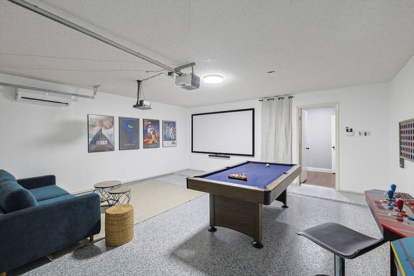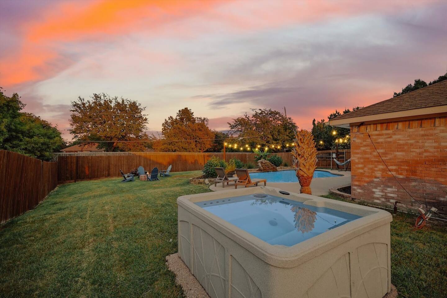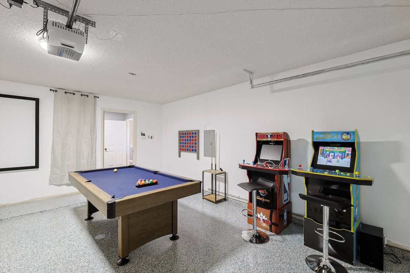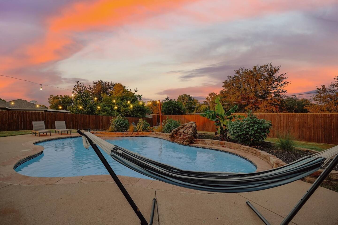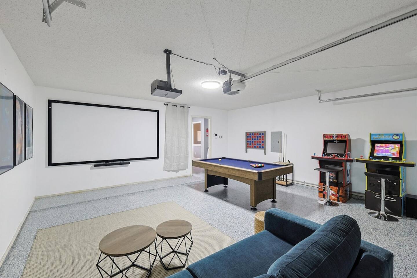 The sleeping arrangements of this single-level home are as follows: Bedrooms: Primary Bedroom: King Bed Bedroom 2: 2 Queen Beds Bedroom 3: Queen Bed +Sofa Bed Bedroom 4: Queen Bed Bedroom 5: 2 Twin-Over-Twin Bunk Beds Bathrooms: Bathroom 1: Full Bathroom (Primary Bedroom Ensuite) Bathroom 2: Full Bathroom The common areas of our property are truly the heart of the home. Enter the cinema room and experience the ultimate movie night with a full cinema screen, ensuring an immersive entertainment experience for all. But that's not all – the gaming room is a paradise for gamers and fun-seekers alike. Enjoy friendly competition with two arcades and a pool table, surrounded by comfortable seating for spectators or those who prefer to relax and watch the action unfold. As you step outside, you'll be greeted by your private backyard oasis. Take a refreshing dip in the sparkling pool to beat the Texas heat or unwind in the indulgent hot tub, perfect for soothing tired muscles after a day of exploration.