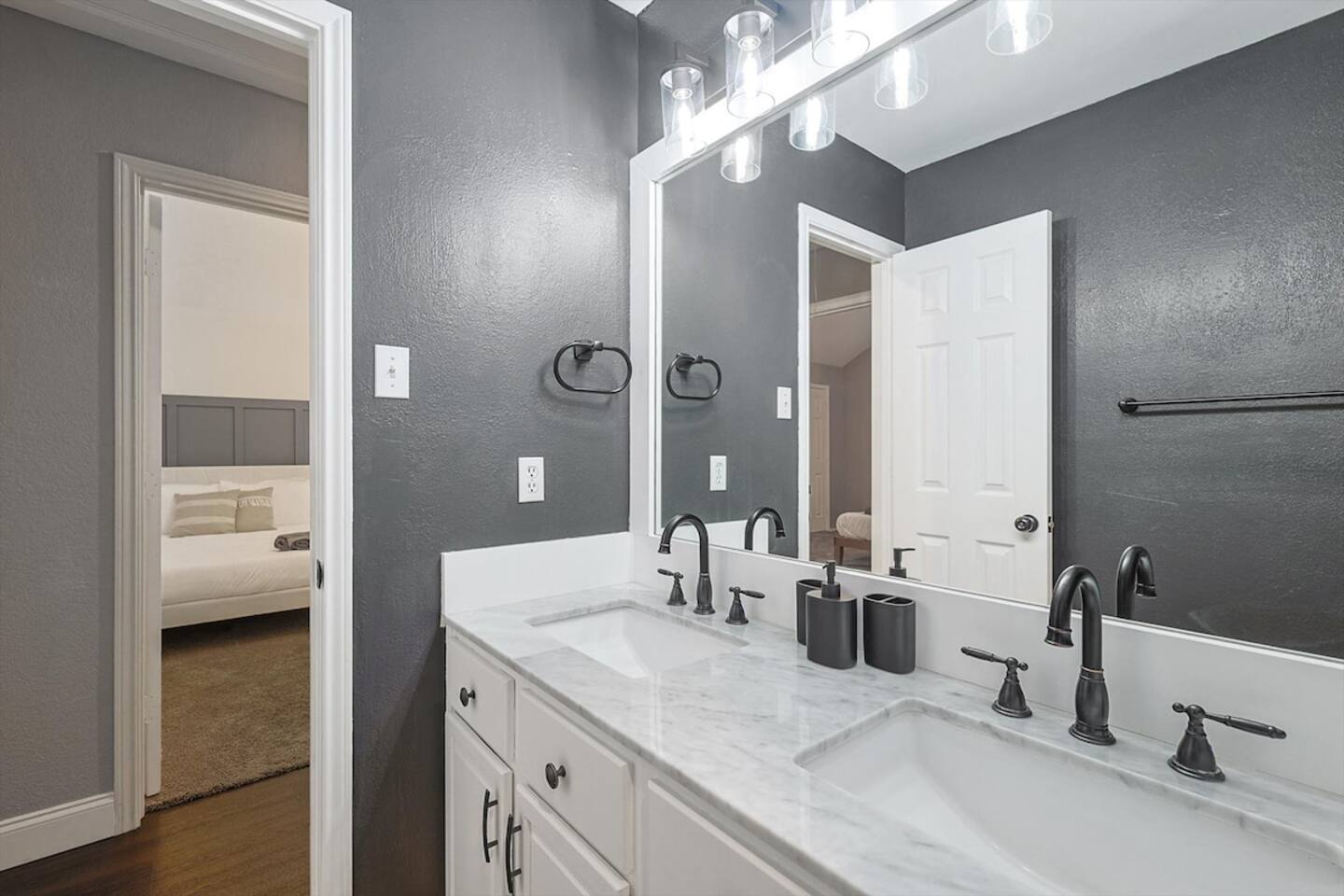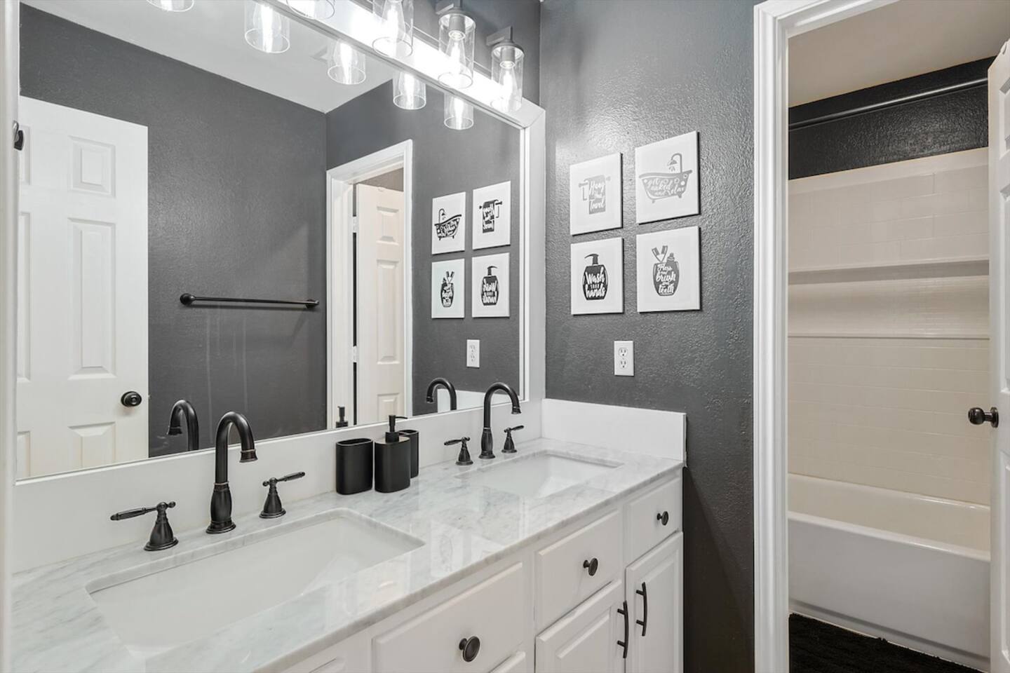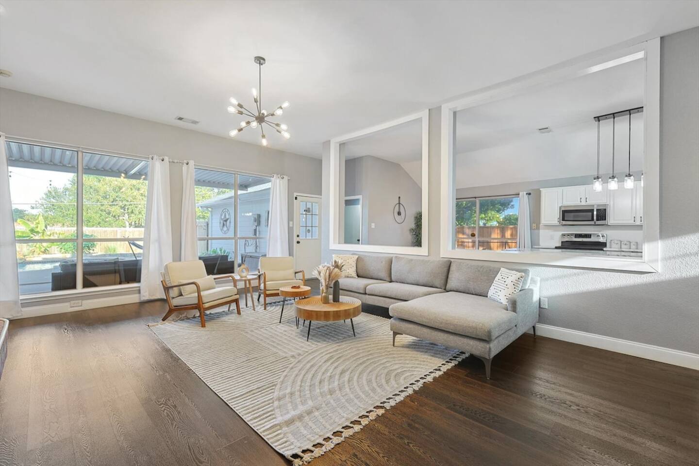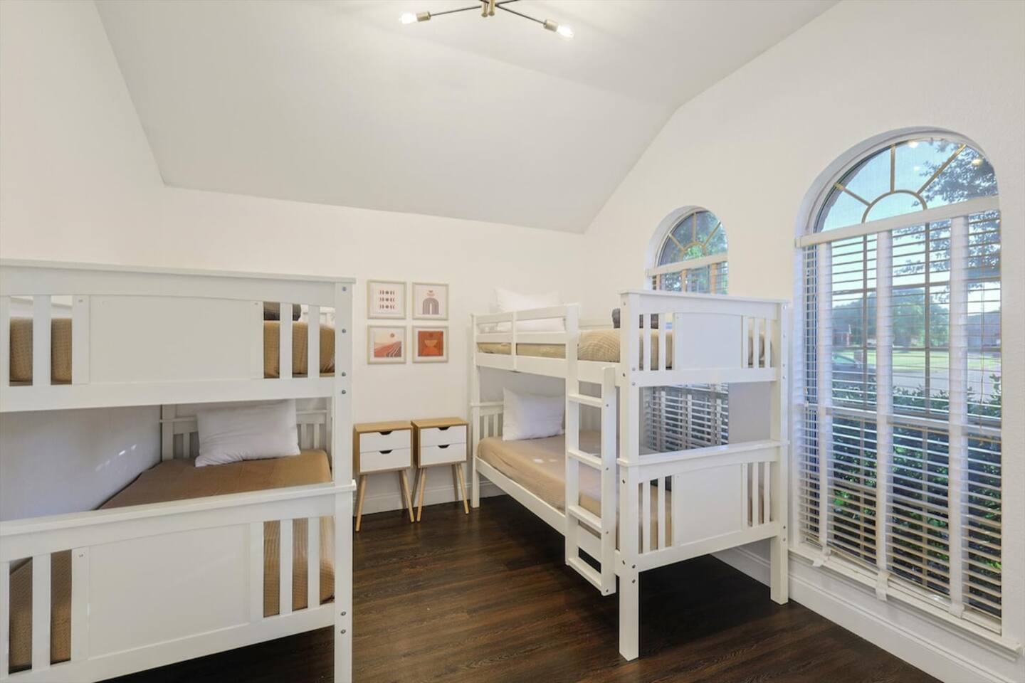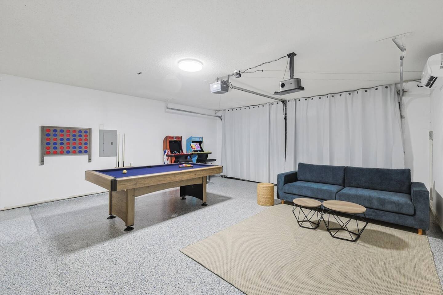 The sleeping arrangements of this single-level home are as follows: Bedrooms: Primary Bedroom: King Bed Bedroom 2: 2 Queen Beds Bedroom 3: Queen Bed +Sofa Bed Bedroom 4: Queen Bed Bedroom 5: 2 Twin-Over-Twin Bunk Beds Bathrooms: Bathroom 1: Full Bathroom (Primary Bedroom Ensuite) Bathroom 2: Full Bathroom The common areas of our property are truly the heart of the home. Enter the cinema room and experience the ultimate movie night with a full cinema screen, ensuring an immersive entertainment experience for all. But that's not all – the gaming room is a paradise for gamers and fun-seekers alike. Enjoy friendly competition with two arcades and a pool table, surrounded by comfortable seating for spectators or those who prefer to relax and watch the action unfold. As you step outside, you'll be greeted by your private backyard oasis. Take a refreshing dip in the sparkling pool to beat the Texas heat or unwind in the indulgent hot tub, perfect for soothing tired muscles after a day of exploration.